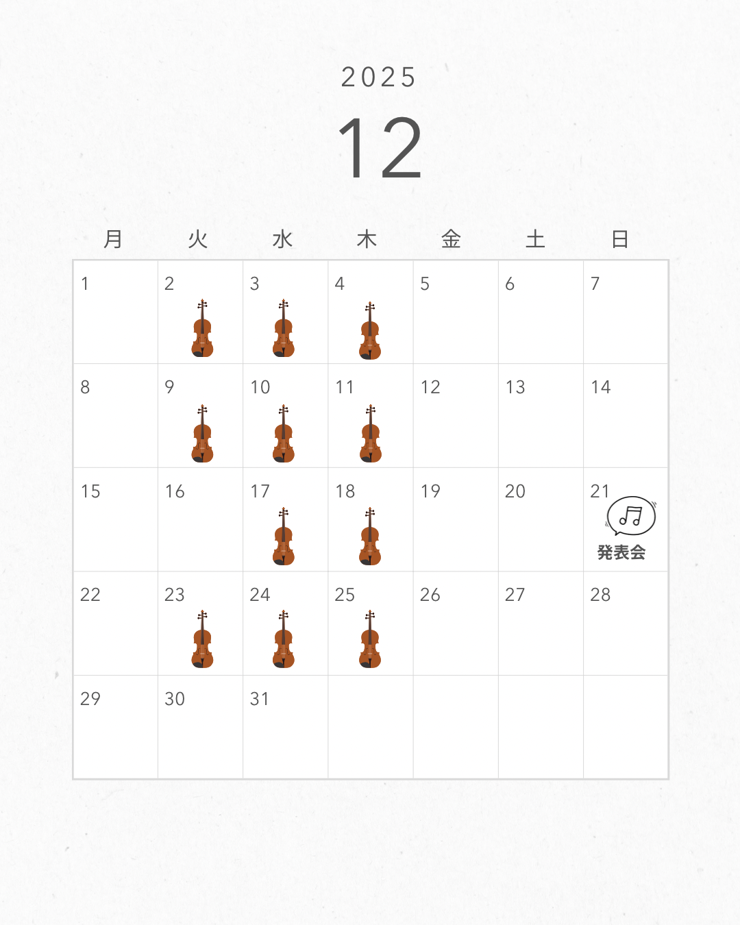 プレバイオリンコース 2歳〜3歳 月3回(年36回) 1回30分 6,000円/月 |