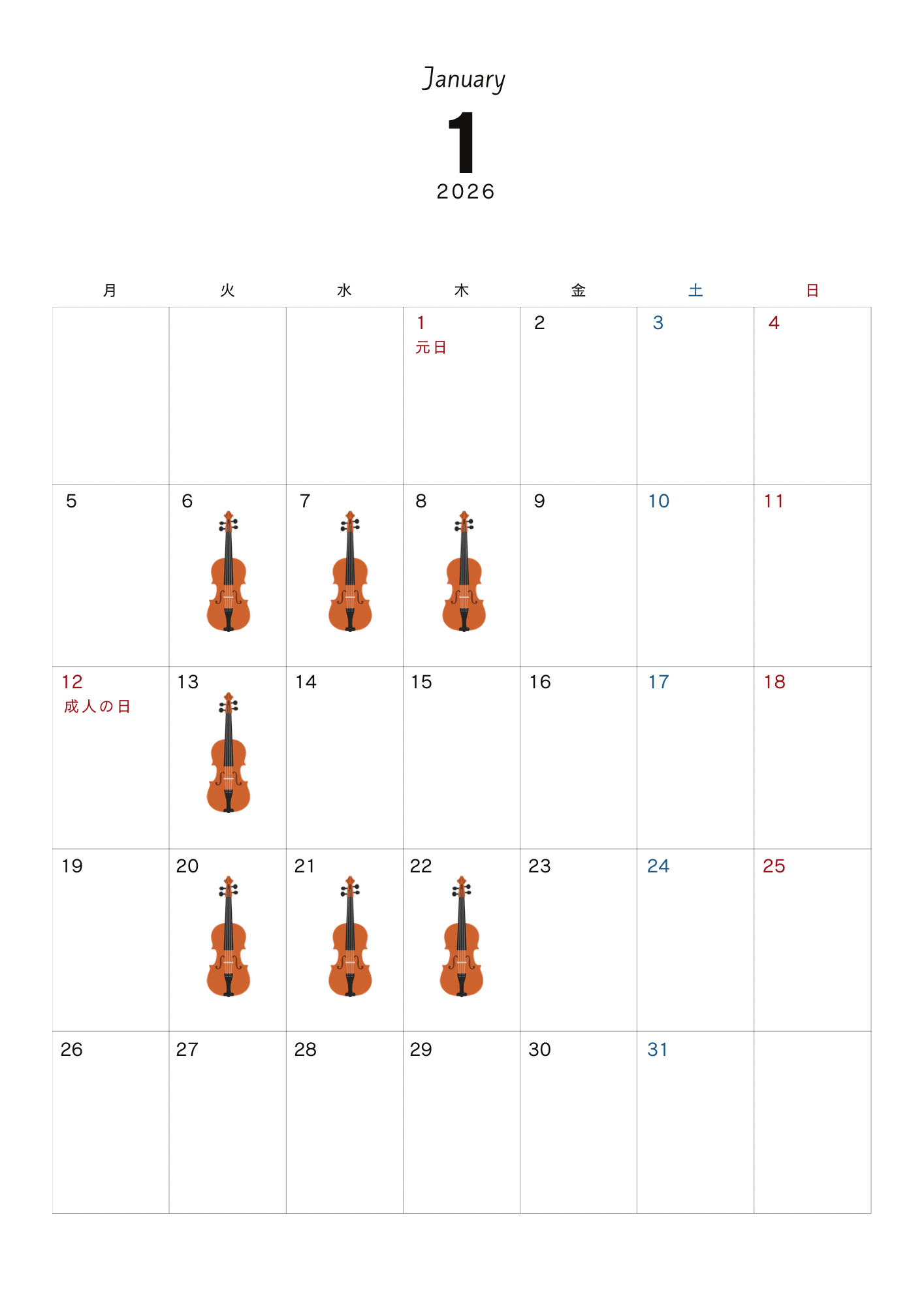 レッスン日 火曜日 15:00〜19:00 水曜日 15:00〜19:00 木曜日 16:00〜19:00 土曜日 10:00〜12:00 |